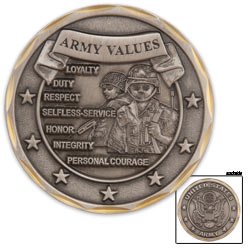 This U.S. Army collector's coin is perfect for Army soldiers and enthusiasts alike. Carry this coin as a constant reminder of the U.S. Army's values: loyalty, duty, respect, selfless-service, honor, integrity, personal courage. This solid metal coin displays these values on one side, while the reverse side features a 3D relief of the U.S. Army crest. 1 5/8" diameter.Customer Reviews